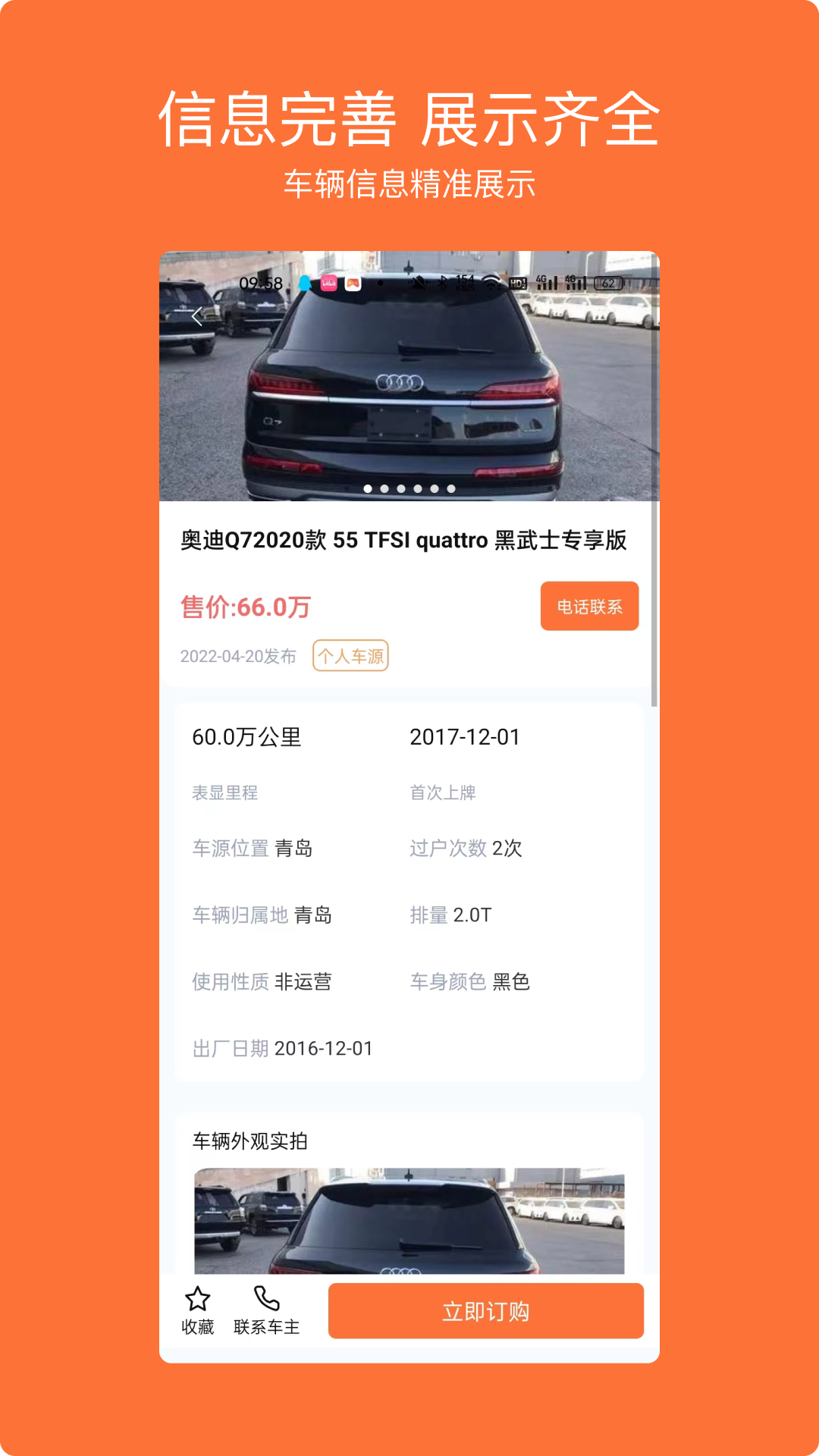 - 信息完善展示全:每辆车都配有高清实拍照片、详细参数配置和完整历史报告,支持360度全景看车;