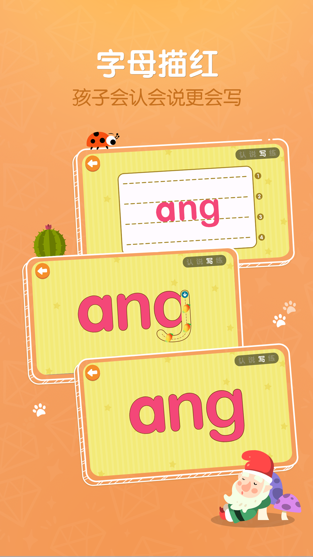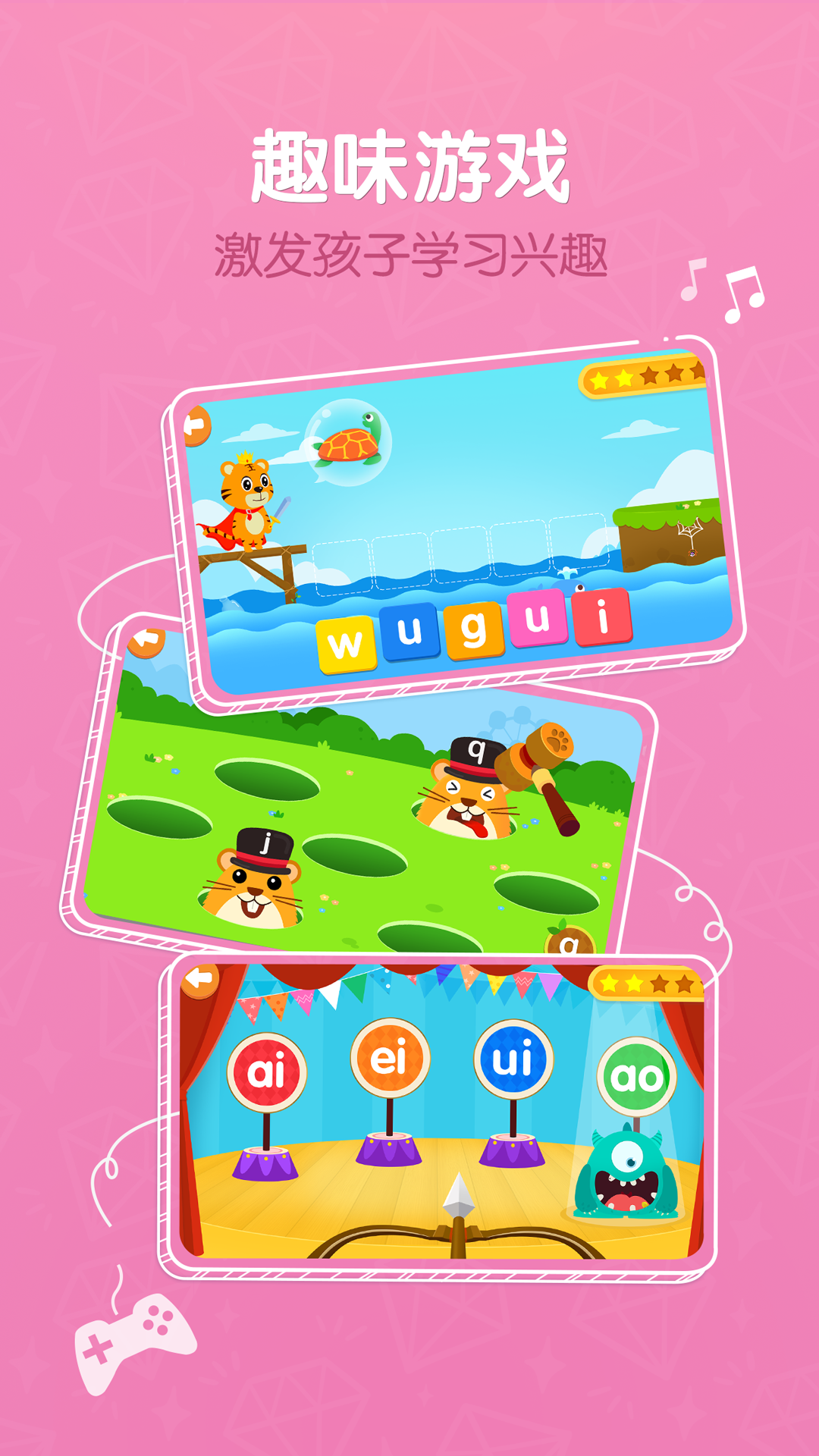 科学教纲:内容设计严格遵循国家语委标准,由资深语文教育专家参与研发,确保教学内容的专业性和系统性。软件采用螺旋式课程设计,知识点由浅入深,符合儿童认知发展规律。内容丰富:除了基础的拼音教学,还包含100张常用词汇卡片和近200个汉字拼音练习,帮助孩子建立拼音与汉字的联系。形式活泼:创新的游戏化教学模式,将知识点融入趣味情境,如太空探险、海底世界等主题场景,让孩子在探索中学习。画面精致:采用国际领先的儿童UI设计理念,界面简洁明了,色彩明快但不刺眼,保护儿童视力。所有动画角色都经过专业儿童心理学家的评估,确保形象健康积极。