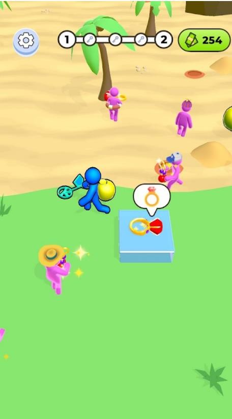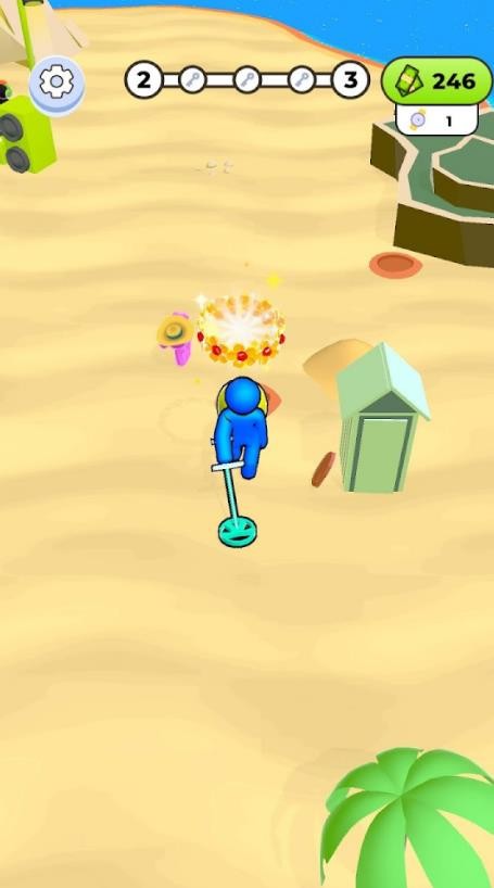 1、游戏拥有超大的沙滩地图,玩家可以自由探索,使用铲子挖掘黄金,感受真实的淘金体验。随着关卡的推进,还能解锁更多隐藏区域,发现稀有宝藏。