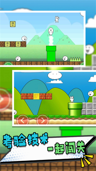 2、游戏包含数十个精心设计的关卡,玩家需要按照顺序逐一挑战。操作方式采用经典的虚拟按键布局:左侧虚拟摇杆控制猫里奥的左右移动,右侧按键负责跳跃动作。随着关卡推进,玩家还会解锁更多特殊动作,如二段跳、滑铲等,这些技能将帮助应对更复杂的关卡设计。