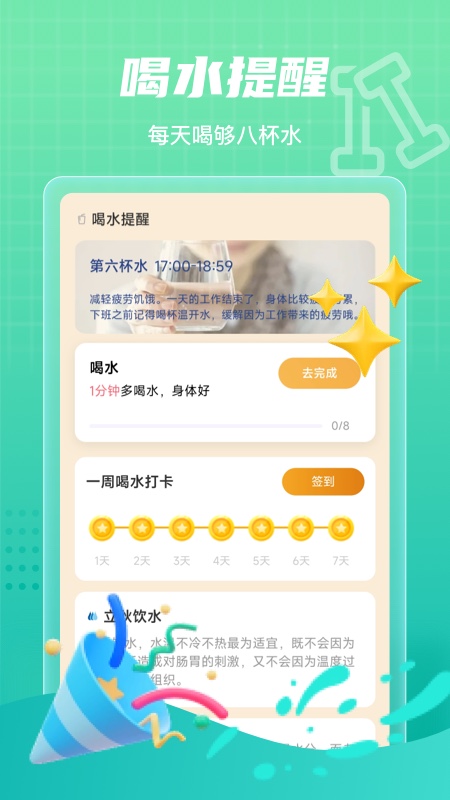 根据您的体重、活动量和环境温度,智能计算出每日建议饮水量。app会定时提醒您补充水分,确保身体始终保持最佳水合状态。完善的饮水记录功能让您随时掌握每日饮水进度,培养健康的饮水习惯,促进新陈代谢,让肌肤更水润,身体更轻盈。