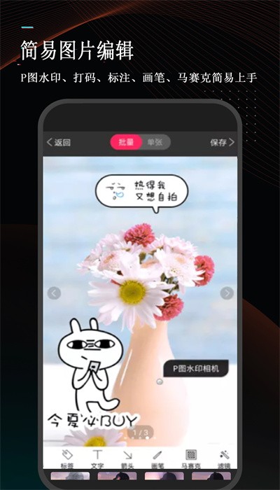 4、图片涂鸦:提供多种涂鸦工具和画笔样式,用户可以自由发挥创意,在图片上进行个性化创作,让每张图片都充满个人特色。