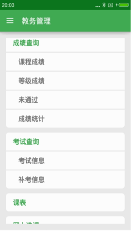 软件的教务管理主要包括以下功能:成绩查询(课程成绩、成绩成绩、不及格课程成绩和成绩统计)、考试查询(补考、考试)、时间表、学分要求等。