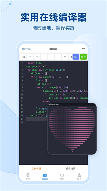 5.【在线编译】手机端写代码,随时随地轻松实践;内置的代码编辑器支持语法高亮和智能提示,让移动端编程体验更加流畅便捷,无需电脑也能完成代码编写和调试。