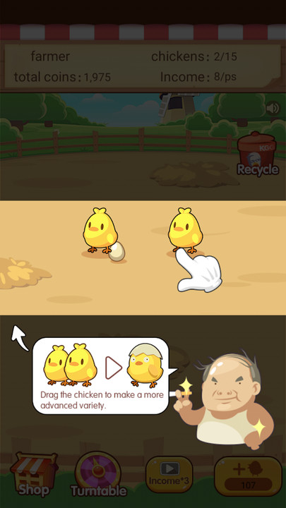 · 创新的合成玩法:通过不断合并升级小鸡,可以获得稀有品种,大大增加了游戏的策略性和可玩性