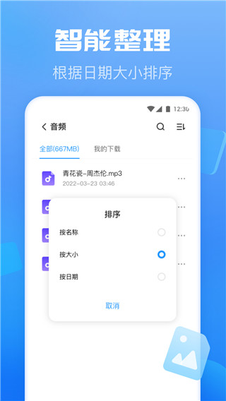 4、【智能整理】独创时间轴管理模式,可按年月日多维度排序,自动归档老旧文件并提示清理。