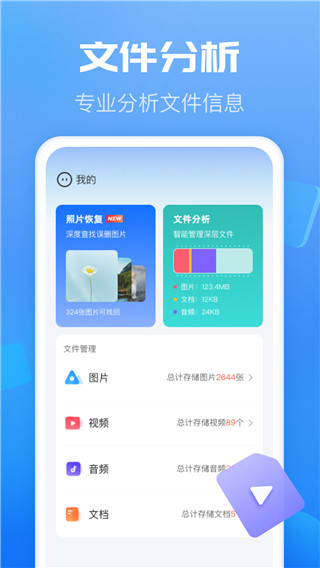 1、下载安装后首次启动会进行全盘扫描,智能分类图片(支持RAW格式)、视频(含4K解析)、音频(识别无损格式)等八大类文件;