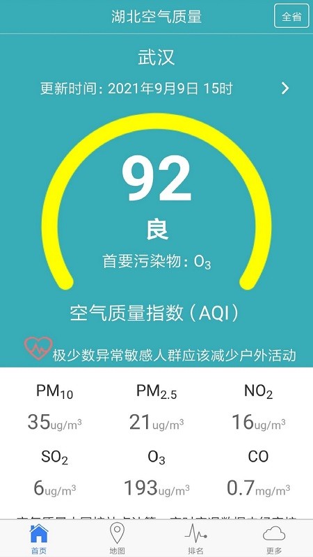 地图模块:全新升级的交互式地图不仅实时显示全省空气质量分布情况,还特别增加了数据更新时间提示功能,确保用户获取的信息始终是最新的。优化后的地图缩放按钮让操作更加流畅,支持手势缩放和区域定位,方便用户快速查看目标区域。