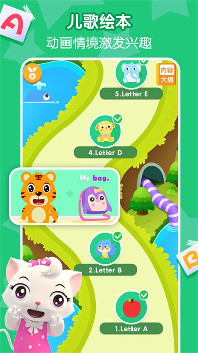 2.律动英文儿歌:收录了100+首原创英文儿歌,旋律优美、节奏明快,通过反复聆听培养孩子的英语语感,实现"磨耳朵"式学习。