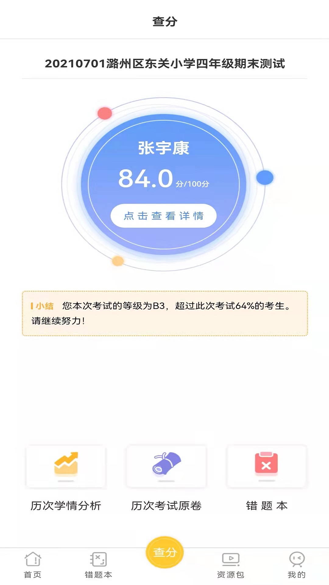 3、学情历史追踪,系统完整记录历次考试的学习分析数据,家长可以随时调取查看,了解孩子的学习进步情况。通过长期数据对比,发现学习规律和问题。