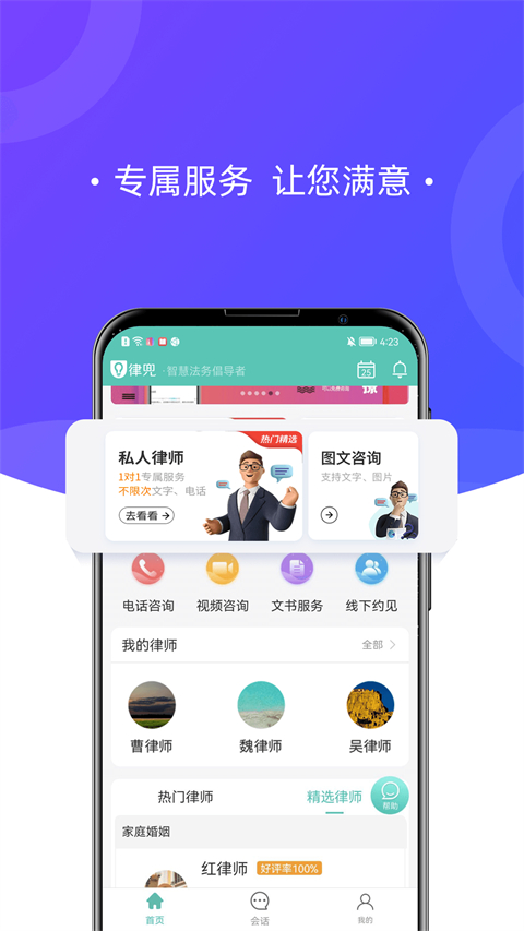 首先我们打开软件进入首页,在这里可以看到各类法律服务和推荐律师。首页设计简洁明了,用户可以根据需求选择不同的咨询入口。如果是首次使用,系统会引导完成简单的注册流程。
