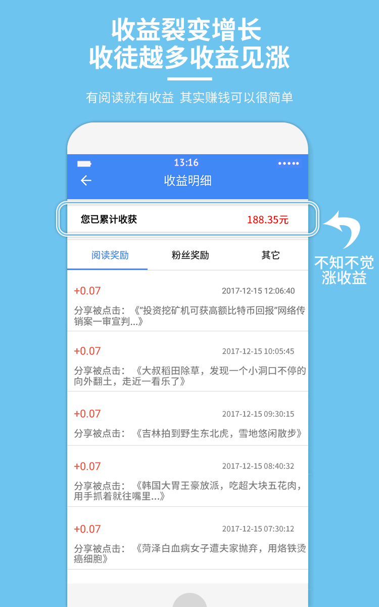 3、不知不觉涨金币:有阅读就有收益,轻轻松松鼓钱包;系统会自动统计每篇内容的阅读量,金币实时到账,收益透明可见,让你在阅读过程中就能感受到钱包的增长。