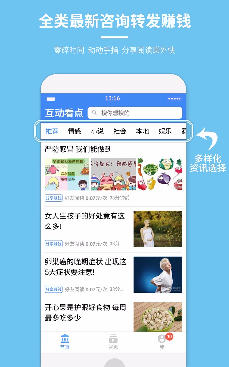 《互动看点》是一款集新闻阅读与收益获取于一体的手机软件,让你在了解最新资讯的同时还能轻松赚取收益。每天实时更新海量热门新闻、精美文章和精彩视频,满足你对各类资讯的需求。通过简单的分享操作,即可让好友阅读你推荐的内容,每点击一次都能为你带来金币奖励。无论是零碎时间还是闲暇时刻,动动手指就能让钱包鼓起来。邀请好友加入还能获得额外收益,赚钱就是这么简单!快来下载体验吧!