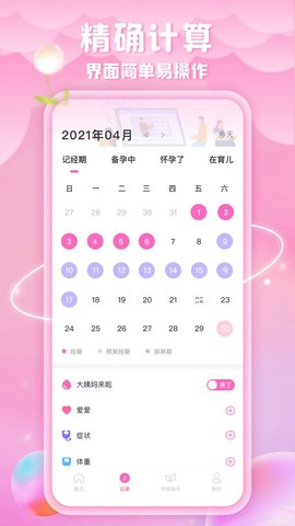 创新的圆盘式周期展示界面,直观呈现当前处于月经周期的哪个阶段。2、日历视图支持快速查询历史记录,同时显示未来3个月的预测日期。3、智能统计功能可生成周期波动图表,自动计算平均周期天数。4、极简操作设计,3秒即可完成经期开始和结束的记录。