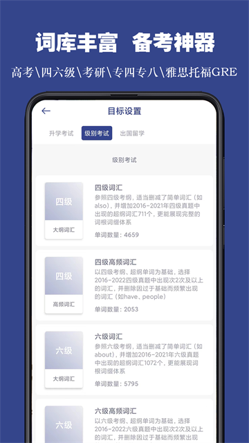 个性化定制。专为各类考试考生精心设计备考方案,全面覆盖从基础教育到出国留学的全阶段需求,包括高考、考研、四六级等国内考试,以及雅思、托福等国际语言测试,甚至包含GRE、SAT等学术类考试词库,用户可根据自身学习目标自由切换不同词库模块。