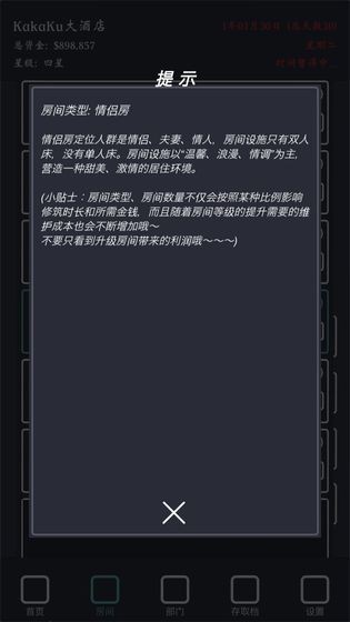 趣味十足的经营,其中的内容十分的多,并且过程有趣。游戏通过丰富的随机事件和剧情任务保持了长期的可玩性。从处理顾客投诉到应对卫生检查,从举办促销活动到参加行业展会,每个经营环节都充满变数。游戏还设计了成就系统和排行榜,让玩家可以与朋友比拼经营成果。随着酒店星级提升,玩家将面临更复杂的经营挑战,如管理跨国连锁酒店或打造特色主题酒店等。