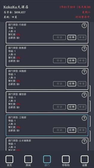 招聘问题,不管他过几天能力强的就被招走了,一直看又总要点暂停!而且正常来说,名校和猎头招聘花钱可以,社会招聘就不用花钱了吧,你开个酒店难道没人自己投简历吗,这个可以安排个人事部的,然后每个月随机刷新出几个人多好呀,员工离职,这个也有人说了,正常是按照工龄每年涨多少钱,员工职位不同钱不同,分级涨工资,不过游戏应该很难做出来?