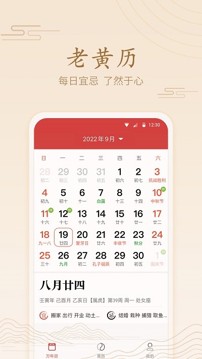 2、内置全面的老黄历信息,涵盖搬家、出行、结婚等各类宜忌事项,帮助您提前规划重要日程,选择最佳时机;