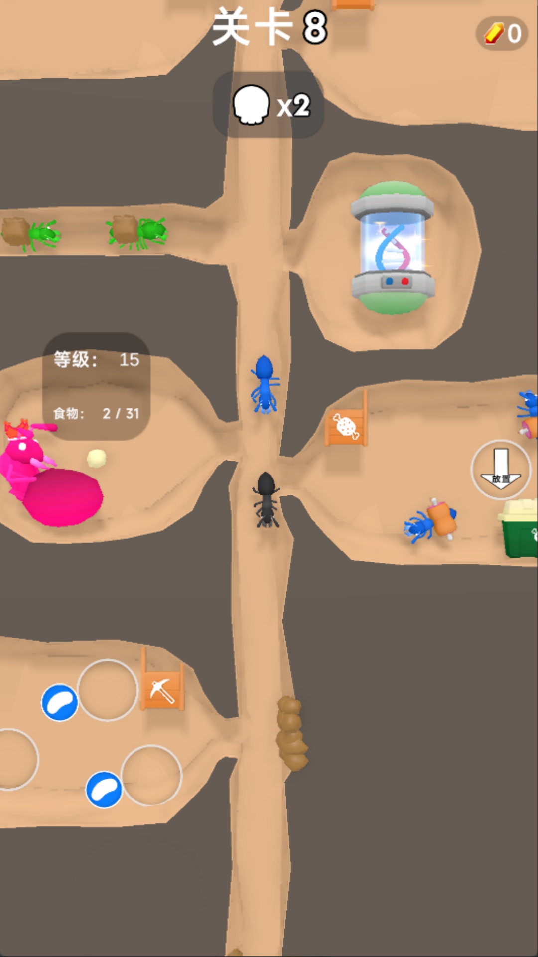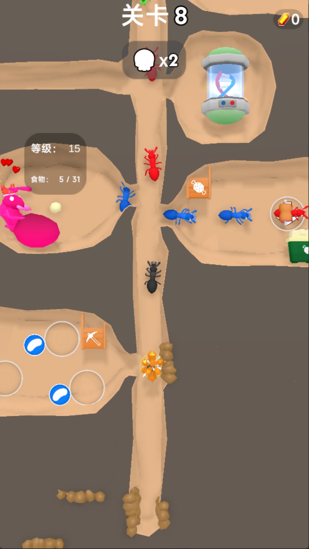 从一个小小的蚁穴开始,逐步扩展成为令人惊叹的地下王国。游戏提供了丰富的建筑选项,你可以建造专门的储藏室来保存食物,设计复杂的防御工事来抵御入侵者,甚至开发特殊的孵化室来加速蚁群繁殖。随着王国规模的扩大,你需要不断优化地下通道的布局,确保工蚁们能够高效地在各个区域之间穿梭。游戏中的物理系统会真实模拟土壤特性,不同深度的土层会有不同的挖掘难度和资源分布。记住,一个成功的蚂蚁王国不仅需要空间,更需要智慧的战略规划。