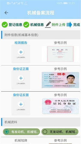 上传相关检测报告图片和身份证图片,登记车主机械记录。