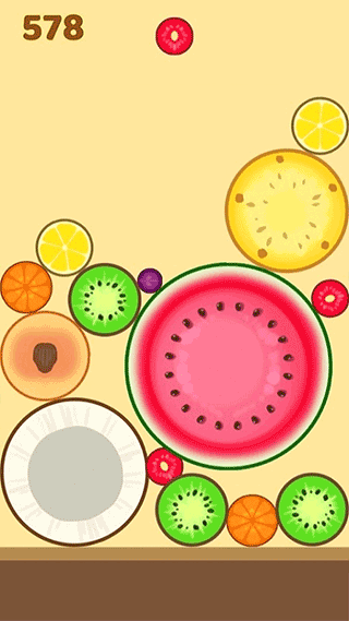 2、通过手指滑动控制水果的移动方向,让相同种类的水果相互接触,触发合成效果;
