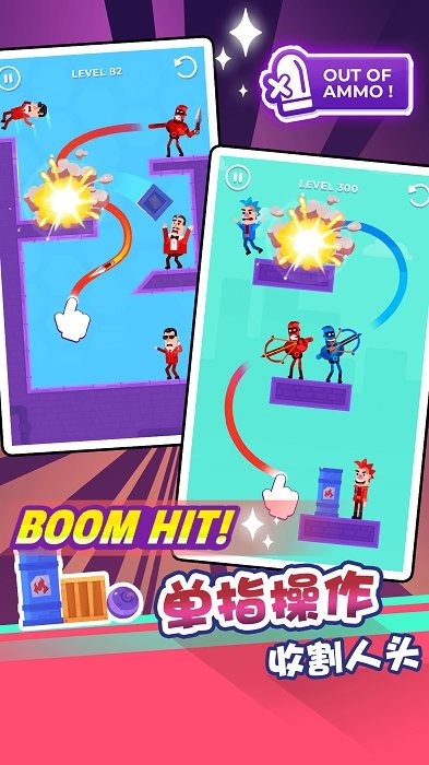 2、松开手指即可完成致命一击,独特的物理反弹机制让你可以利用环境进行巧妙射击,游戏中还准备了海量强力武器供你选择,每把武器都有不同的射击特性。