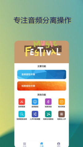 一款专业提取伴奏工具,可以快速的将视频中的声音提取出来,并提供音频裁剪,音频转换,音频合并,音量调整,音频加速,音频降噪,格式转换等专业的音频处理工具,并可以把制作完成的音乐分享给你的小伙伴