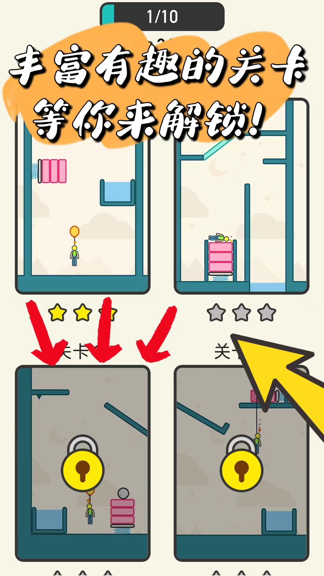 游戏的核心玩法围绕着物理互动展开:玩家可以通过点击红色方块切断绑着火柴人的绳索;使用锥子道具可以扎破气球;遇到红色气球时也可以直接移除它们。每个关卡都设置了时间限制,玩家必须在爆炸倒计时结束前完成救援。游戏还设计了多种互动元素,如弹簧、传送门等,为解谜过程增添更多可能性。记住,有时候需要先切断特定的绳索才能成功解救火柴人,这考验着玩家的观察力和逻辑思维能力。