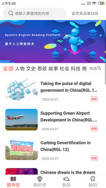 4、文章阅读:每日精选6篇时效性文章,配备"读前预测""读后思辨"等引导问题。长按单词即可查询释义,并自动加入生词本。