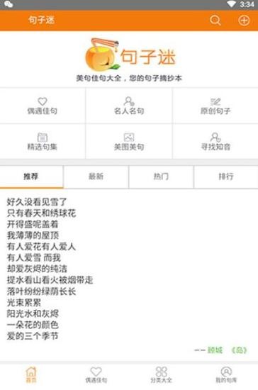 句子迷app是由潮州聚文信息技术有限公司精心打造的一款句子百科软件,它不仅是一个便携的电子摘抄本,更是一个汇聚海量优质句子的专业平台。在这里,用户可以随时随地发表个人创作的优美句子,收藏打动心灵的经典语录,还能通过智能搜索快速找到心仪的句子。软件收录了包括名人名言、诗词佳句、影视台词、网络热梗等各类精彩语句,堪称移动端的句子百科全书。无论是想用文字表达情感、记录生活感悟,还是寻找写作灵感,句子迷都能满足您的需求。