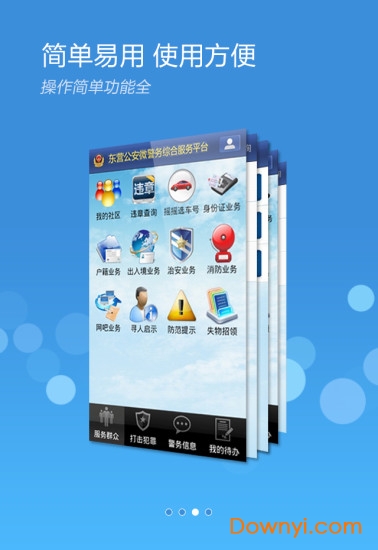 为全面提升公安机关为民服务水平,东营公安分局以"便民、利民"为核心理念,创新推出了手机版便民服务平台——东营公安微警务综合服务平台。该平台采用现代化UI设计,将复杂的警务工作内容以清晰直观的界面呈现,实现了通讯设备与业务处理设备的完美融合。作为一站式警务服务平台,它集成了咨询、办事、举报、投诉、监督、考核、服务等全方位功能,包含六大核心模块:快速查询通道、服务群众专区、打击犯罪专区、警方信息发布、警民互动平台以及智能后台管理系统。