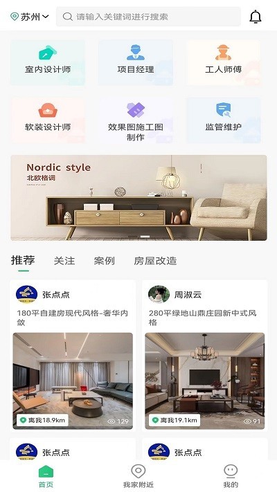 【我家附近】基于LBS定位技术,智能推荐周边优质装修资源。用户可查看附近工地的实景案例、正在施工的邻居家装进度,还能预约参观样板间,获得最直观的装修参考。