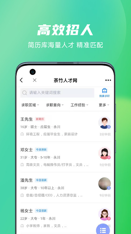 茶竹人才网app是茶竹永川网旗下专业的招聘服务平台,依托永川14年互联网服务经验,深耕本地就业市场。平台以"服务永川、助力就业"为宗旨,为求职者精准推送永川地区优质岗位信息,同时为企业提供高效的人才招聘渠道,致力于帮助每一位求职者在永川找到心仪的工作,实现职业理想。