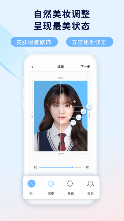 该软件采用先进的人脸识别算法,能够帮助用户快速完成证件照拍摄和美化处理。在保证照片真实性的前提下,提供多种自然美化功能,包括智能磨皮、肤色美白、眼睛放大、面部瘦脸、美瞳效果以及嘴唇润色等。所有参数均可自由调整,让您随时随地打造出既专业又自然的证件照。无论是光线不足的环境,还是面部存在瑕疵,软件都能通过AI技术进行智能优化,确保最终效果令人满意。
