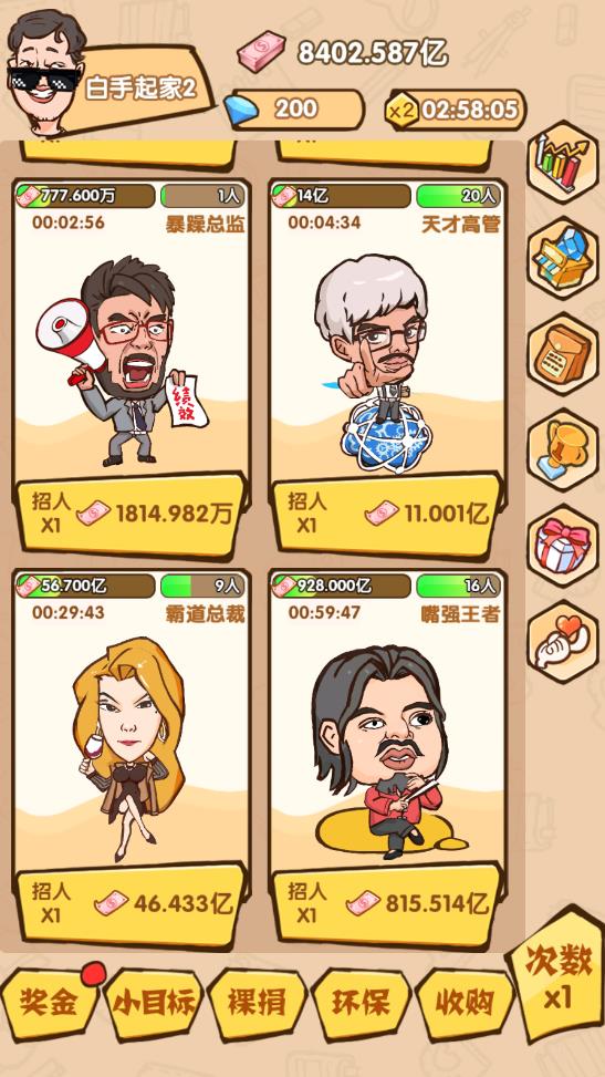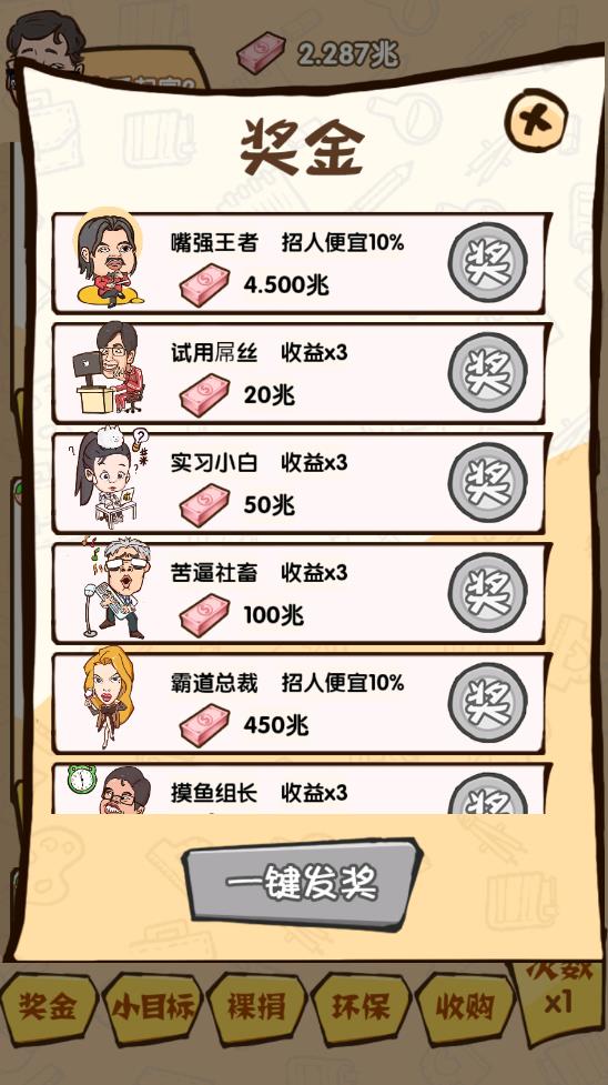 2、游戏中的人物都是各种搞笑的卡通人物,员工和公司老板,员工产生收入,老板来招募更多员工。角色互动充满幽默感,让经营过程不再枯燥。
