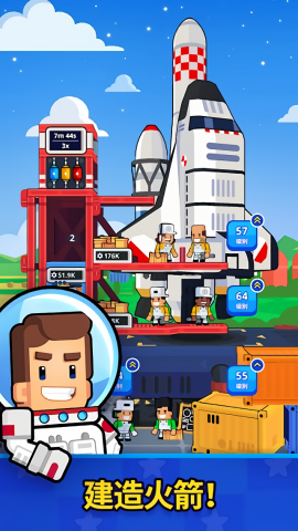 2、工厂升级系统包含生产线优化、机器人替代等多项改进方案。每项升级都能显著缩短火箭建造周期,帮助玩家更快实现太空探索目标。