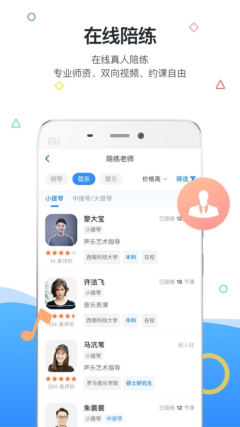 软件支持多种弦乐器练习,包括大提琴、中提琴、小提琴和钢琴等,满足不同音乐爱好者的需求。智能搜索功能可根据用户当前水平推荐合适曲目,帮助您有针对性地提升演奏技巧。专业教师团队提供一对一视频指导,针对性地解决演奏中的难点问题。软件还特别设计了多种练习模式,从音阶练习到乐曲演奏循序渐进。丰富的乐器支持让您可以随时切换学习不同乐器,海量乐谱资源涵盖古典、流行等多种风格,为您提供高效便捷的音乐学习体验。