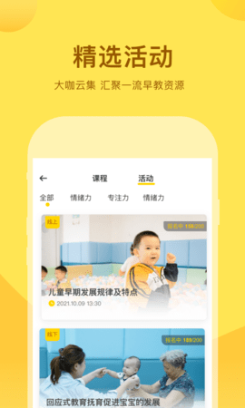 活动中心提供丰富的线上或线下早教活动推荐,家长可以根据孩子的兴趣和需求分类浏览,轻松完成活动报名,拓展孩子的社交圈。