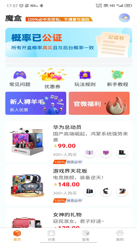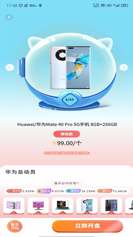 在呱呱app上,您可以找到各式各样的热门盲盒,包括数码产品、品牌手机、限量版手办模型、正版日本扭蛋等上千款潮流商品。平台严格把控商品质量,所有盲盒均为正品保证,让您买得放心、玩得开心。无论是收藏爱好者还是潮流达人,都能在这里找到心仪的商品。