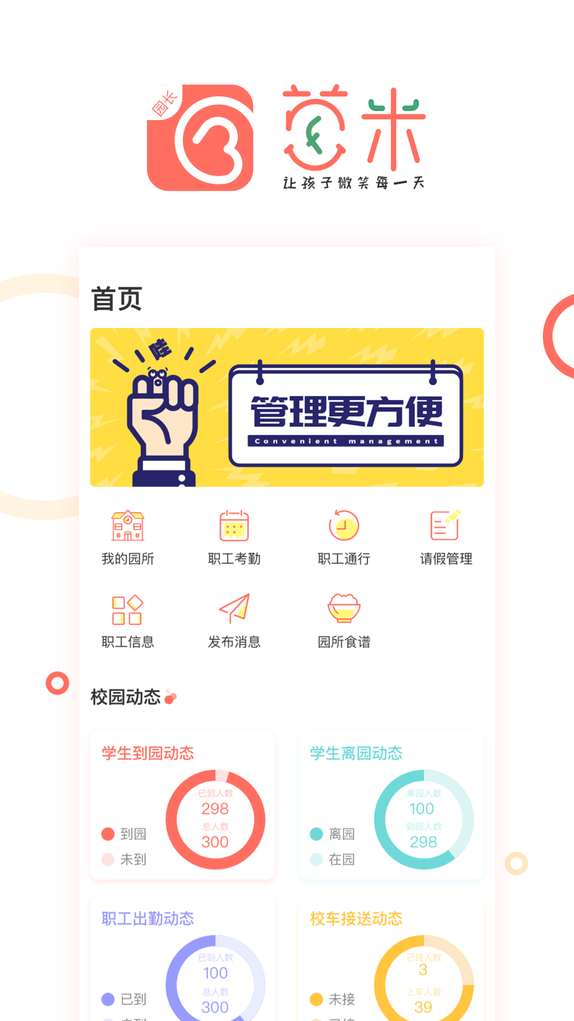 葱米园长版app是一款专为幼儿园管理设计的智能化软件解决方案,致力于通过科技创新提升学前教育管理水平。该软件集成了多项实用功能,包括学校实时视频监控、安全接送系统、家校互动平台以及校务管理工具,为幼儿园管理者、教师和家长搭建了一个高效便捷的沟通桥梁。其人性化的设计理念和强大的技术支持,正在为现代幼儿教育注入新的活力。