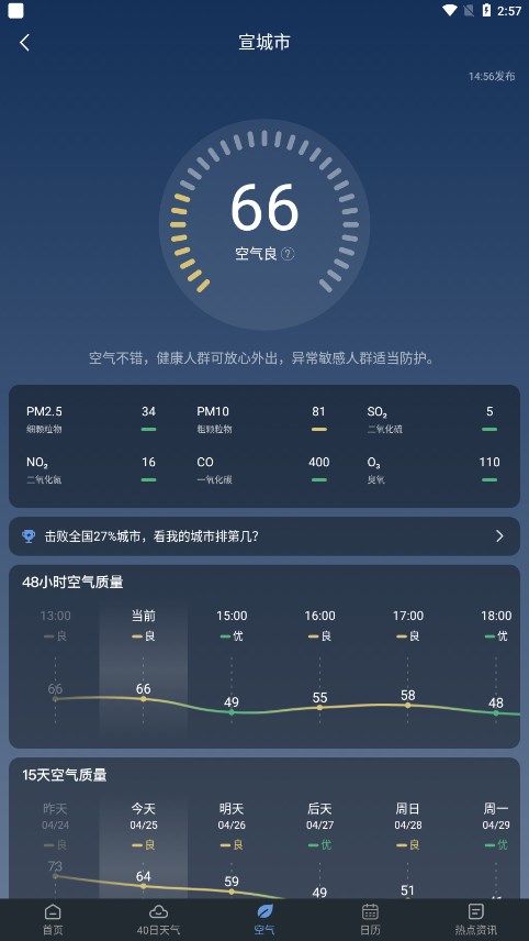 -6项空气指标:全面监测PM2.5、PM10、二氧化硫等空气质量参数,关注呼吸健康;