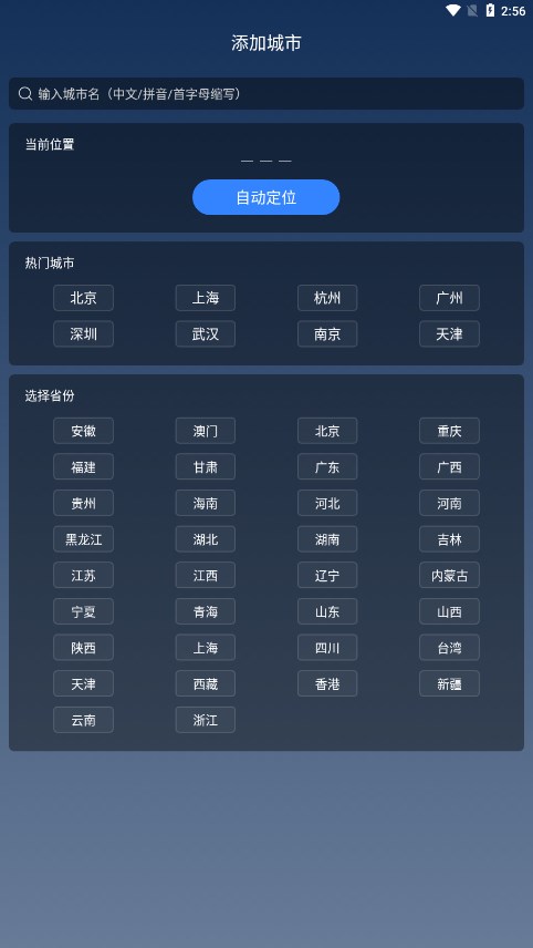 5、城市添加:智能定位当前位置,同时支持手动添加多个关注城市,满足差旅人士和异地家人的需求;