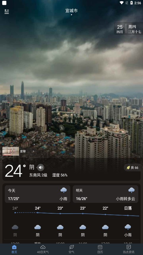 阳阳天气app是一款专注于提供精准天气信息的实用工具,让用户随时掌握城市最新天气动态。无论是短时降雨预报还是未来40天的天气趋势,都能一键查询,数据权威可靠,更新及时。覆盖全国各地的实时天气信息,帮助用户轻松规划生活与出行。从分钟级降雨预测到长期温度变化,阳阳天气以全面的功能和贴心的设计,让天气查询变得更便捷、更智能,成为您日常生活的得力助手。