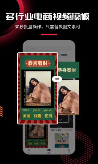 模板加提供批量素材替换功能,只需简单操作就能快速替换图片或视频素材,大大提升制作效率。先进的AI抠图技术可以智能去除图片背景,即使是复杂的图片也能轻松更换底色,完美融入模板设计。智能文字编辑功能支持多种字体样式和颜色设置,帮助您创作出更具吸引力的文案内容,有效提升视频营销效果。所有作品均可云端存储管理,支持在线编辑照片、视频和文字,视频合成过程安全可靠。