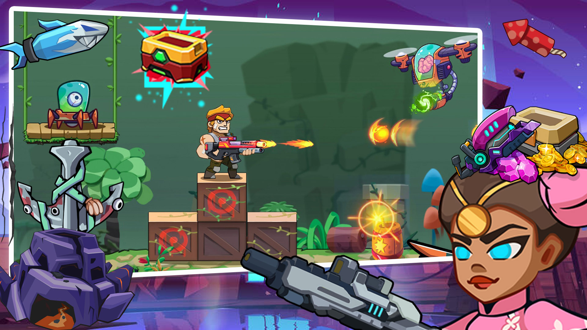 火线逃走机械熊是一款融合了横版动作与射击元素的2D冒险游戏,采用精美的卡通画风设计。游戏中你将与众多性格鲜明的卡通角色一起,在危机四伏的丛林中展开激烈战斗。游戏提供了自动射击功能,让玩家可以专注于走位和战术策略。你将扮演一名肌肉发达的突击队枪手,使用各种强力武器对抗源源不断的怪物大军。游戏中的战斗节奏紧凑刺激,每一次交锋都让人热血沸腾,带来无与伦比的游戏体验。