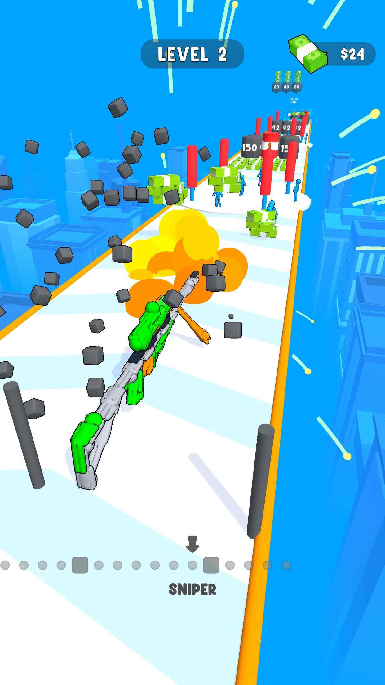 游戏的核心玩法极具创意,玩家在跑酷过程中需要合理使用子弹资源。普通子弹可以用来攻击小型障碍物,而特殊子弹则能摧毁坚固的砖墙。当玩家成功摧毁特定障碍时,还能获得威力强大的临时武器,比如绿色机枪,可以短时间内进行疯狂扫射。游戏最后阶段设有得分环节,玩家在此前的表现将决定最终得分高低。这种将动作、策略和评分系统完美结合的设计,让游戏过程充满变数和挑战。