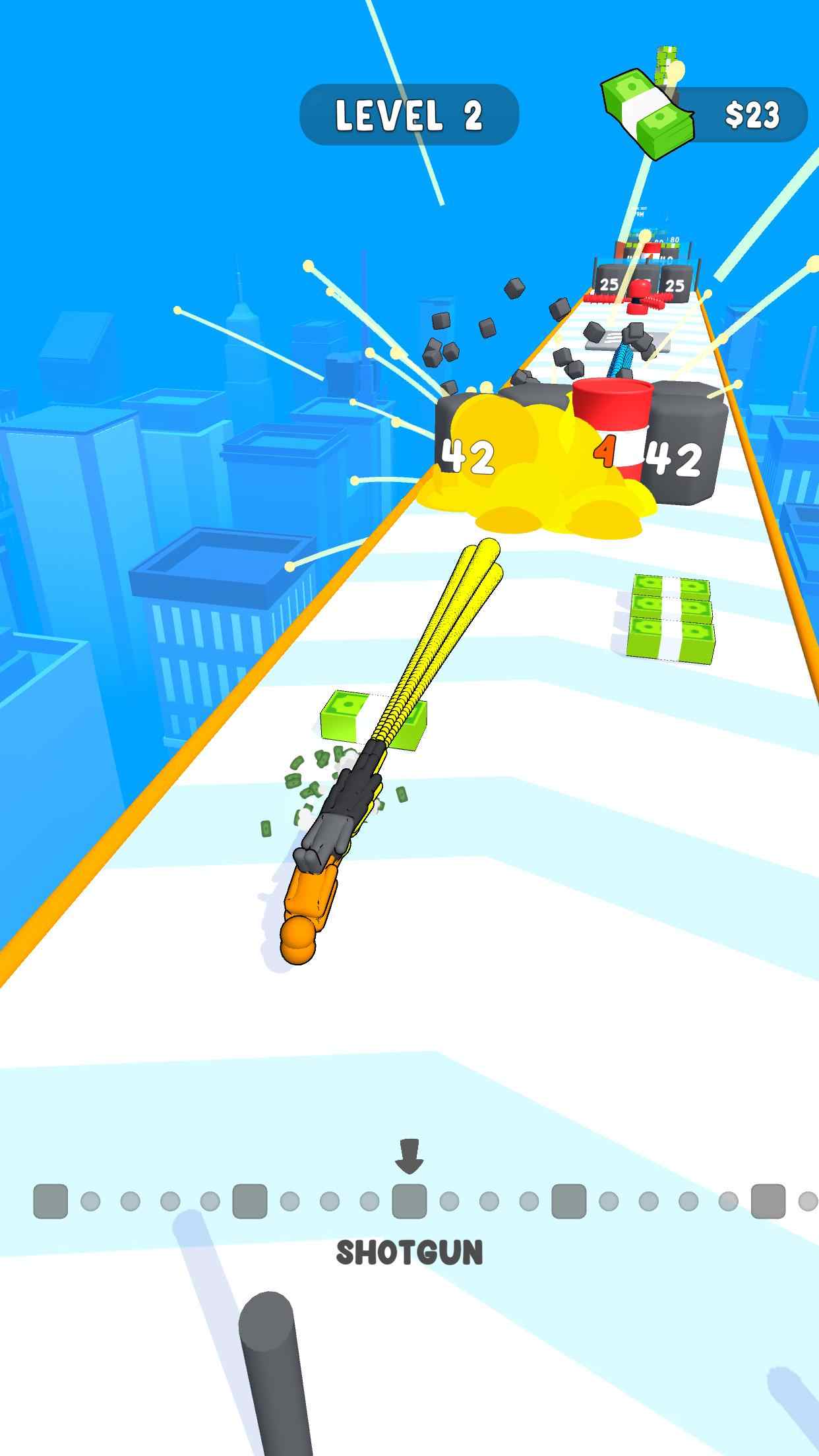 这款游戏打破了传统跑酷游戏的框架,将射击元素巧妙融入其中。玩家不再只是单纯地奔跑躲避障碍,而是可以主动出击,用手枪消灭前方的敌人和障碍物。游戏设计了丰富的子弹补给系统,在跑酷过程中可以随时补充弹药,还能更换不同特效的子弹,比如穿透弹、爆炸弹等,让闯关过程更加爽快。通过精准射击摧毁障碍物,玩家能够开辟新的路径,甚至发现隐藏的捷径,大大提升了游戏的可玩性和策略性。