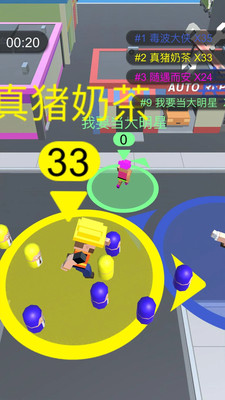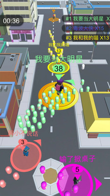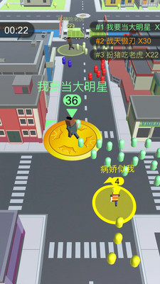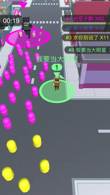 《圈粉大作战》是一款支持多人在线联机的轻竞技吞噬类手游,游戏完美融合了休闲娱乐与竞技对抗的元素。玩家在游戏中将化身为一位初出茅庐的明星,通过在城市各个角落吸引路人成为粉丝来提升自己的实力。游戏地图设计精巧,场景丰富多样,从繁华的商业街到热闹的广场,每个角落都隐藏着成为粉丝的路人。当遇到其他玩家时,你可以指挥自己的粉丝团发起进攻,通过巧妙的走位和策略击败对手,将他们纳入自己的粉丝阵营。随着游戏的深入,玩家的粉丝团会像滚雪球一样越滚越大,最终实现称霸全城的终极目标。
