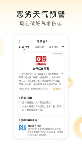 2、预警推送:高温、寒潮、暴雨、台风、雾霾、泥石流等恶劣天气预警及时推送。每种预警都配有详细的防范建议,比如台风来临前的准备工作或高温天气下的防暑措施,确保您能安全度过极端天气。