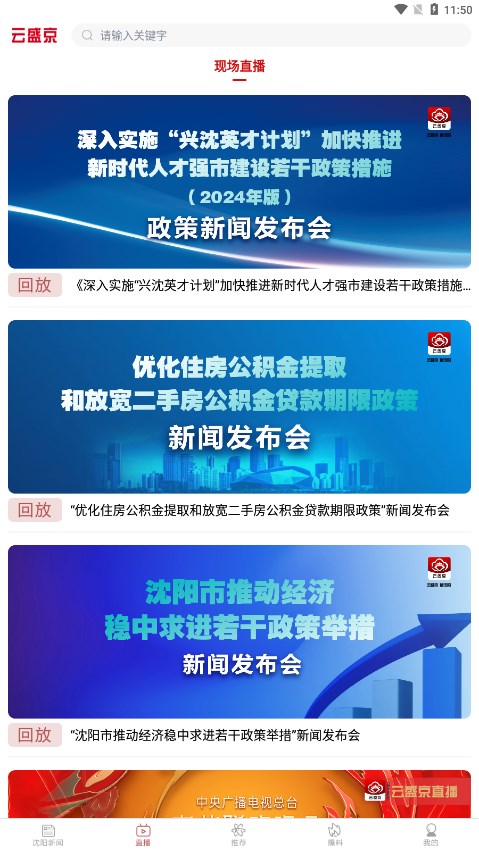 1、打开云盛京APP,进入首页推荐页面,点击右上角的【进直播】按钮,即可进入直播专区。